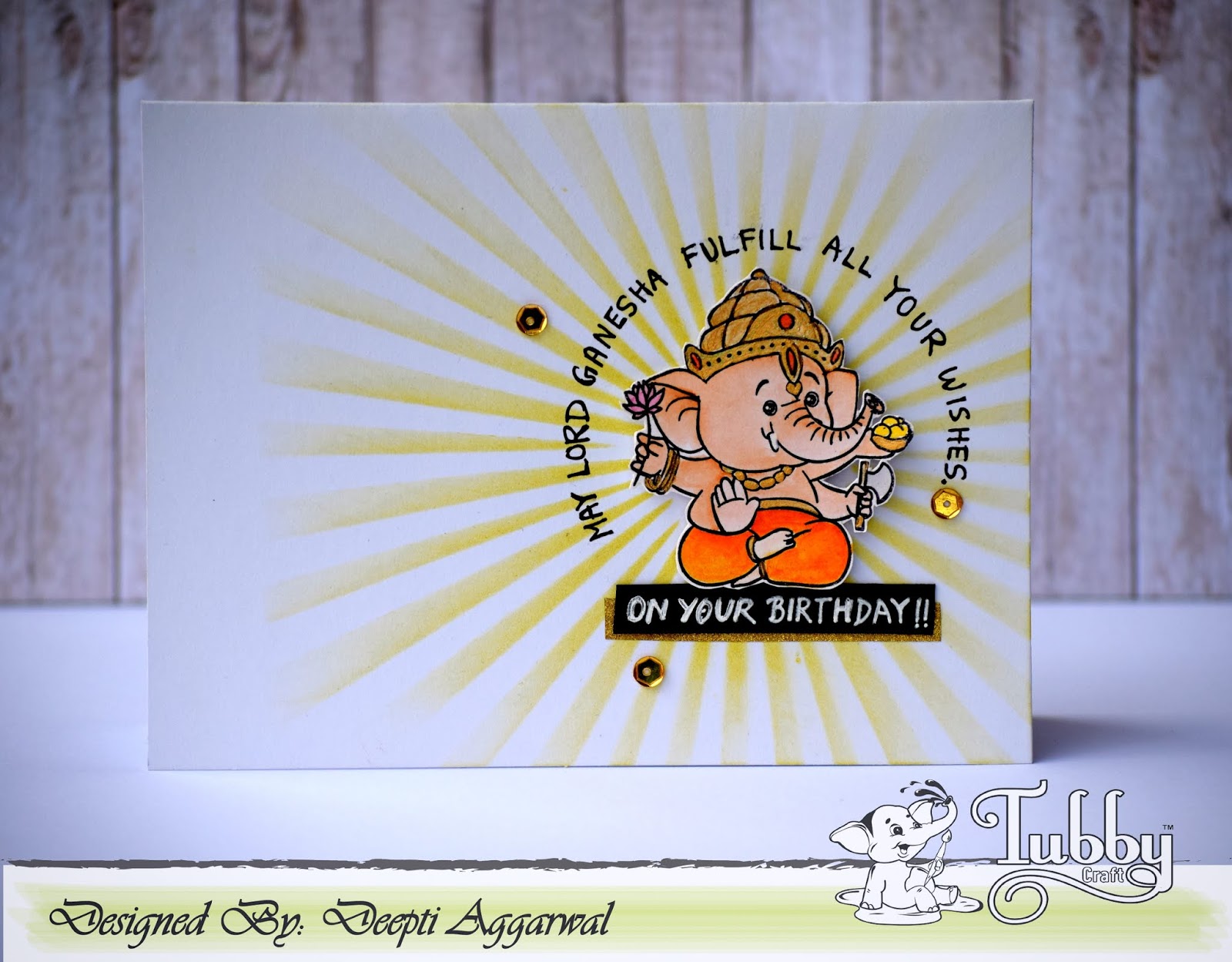 In this card set, I have used cute Ganesha from Diwali stamp set to create two beautiful birthday cards.. Actually this idea was given by my Dad.. he he he.. Yes.. He does give me the ideas...lol 😉. He was looking for a birthday card for his friend but he doesn't want me to add any critter or flower and asked me "Do I have some godly figure stamp"..?? Voila..Here this stamp from Tubby Craft called "Diwali - Ganesha" came to my rescue..😃